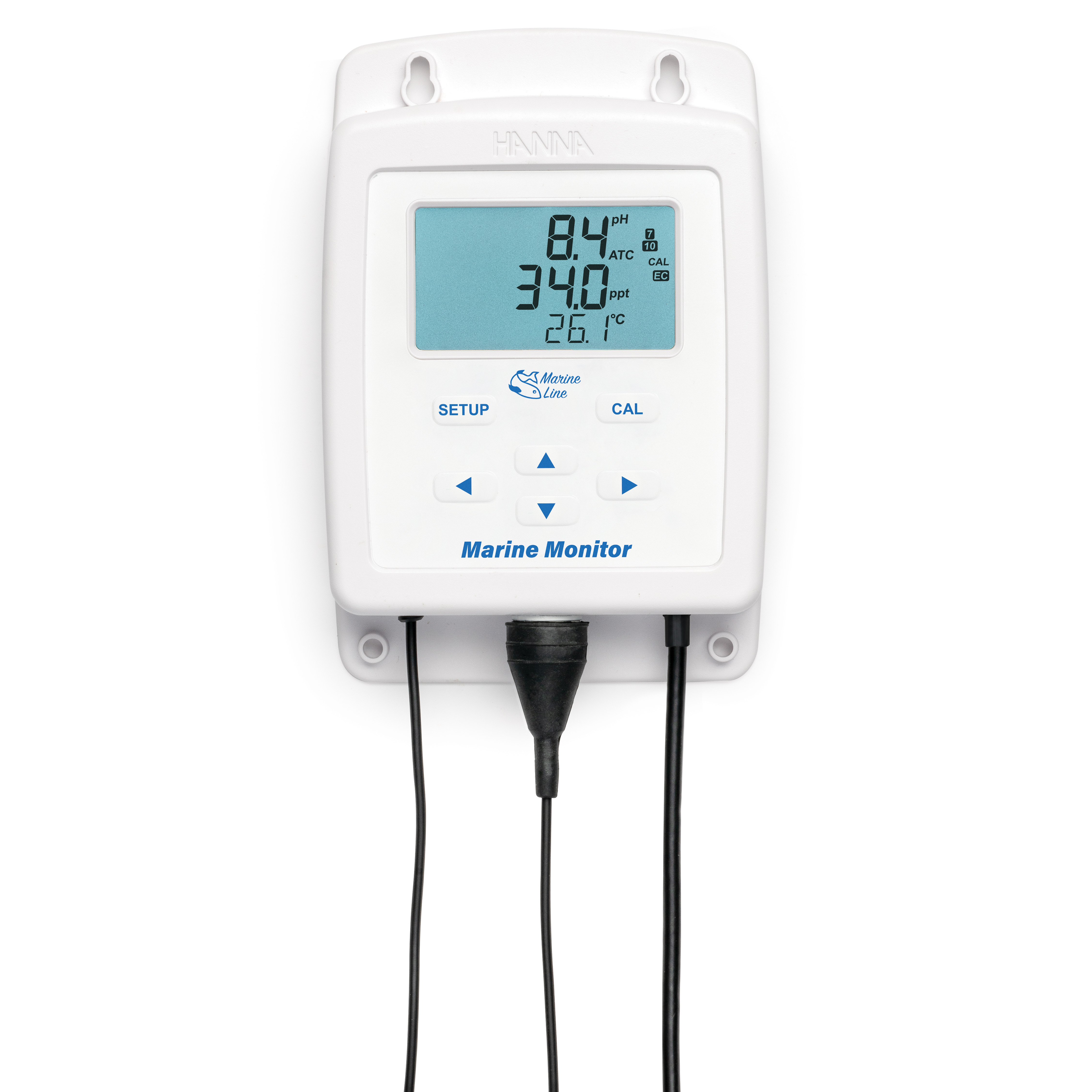Das System kann an einem oder zwei Punkten für den pH-Wert und an einem Punkt für die Leitfähigkeit kalibriert werden. Der Salzgehalt des Meerwassers wird entweder in parts per thousand (ppt), praktischen Salinitätseinheiten (PSU) oder spezifischem Gewicht (S.G.) angezeigt. Für jeden Parameter kann ein Hoch-/Tiefalarm konfiguriert werden. Die Messergebnisse werden kontinuierlich auf einem großen, gut ablesbaren LCD angezeigt.